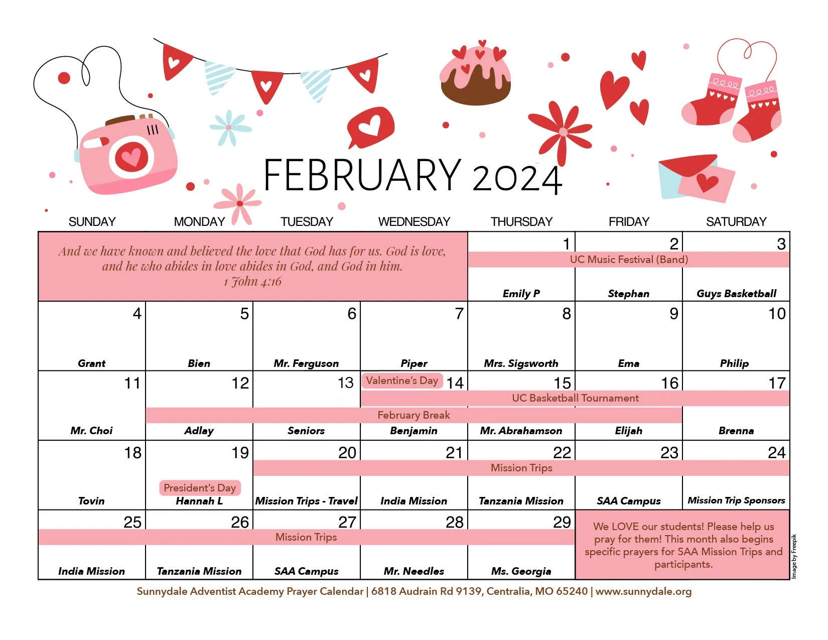 Kristen Kuehmichel 8/8/25 Kristen Kuehmichel 8/8/25 Campus Updates Read More Guest User 5/23/24 Guest User 5/23/24 Photos of Graduation Read More Guest User 5/17/24 Guest User 5/17/24 Graduation Weekend 2024 Read More Guest User 5/5/24 Guest User 5/5/24 Our Hope for the Future Read More Guest User 5/3/24 Guest User 5/3/24 Five Themes of Geography Reflection Read More Guest User 5/2/24 Guest User 5/2/24 May Prayer Calendar Read More Guest User 3/31/24 Guest User 3/31/24 Prayer Calendar -April Read More Guest User 3/25/24 Guest User 3/25/24 Uncomfortableness Helps People Mature Read More Guest User 2/29/24 Guest User 2/29/24 Won’t You Join Us? Read More Guest User 2/29/24 Guest User 2/29/24 March Prayer Calendar Read More Guest User 2/23/24 Guest User 2/23/24 Sunnydale Missions 2024 Missions 2024 Read More Guest User 2/15/24 Guest User 2/15/24 February Prayer Calendar Read More Guest User 1/8/24 Guest User 1/8/24 Why I Donate Blood, & You Can Too Read More Guest User 12/31/23 Guest User 12/31/23 January Prayer Calendar Read More Guest User 12/29/23 Guest User 12/29/23 A Lesson in Opportunity Read More Guest User 12/22/23 Guest User 12/22/23 Forgiveness Read More Guest Bloggers Guest User 12/15/23 Guest Bloggers Guest User 12/15/23 Learning New Things Read More Guest User 12/1/23 Guest User 12/1/23 December Prayer Calendar Read More Guest User 12/1/23 Guest User 12/1/23 What Are Your Character Fruits? Read More Guest User 11/8/23 Guest User 11/8/23 November Prayer Calendar Read More Older Posts
